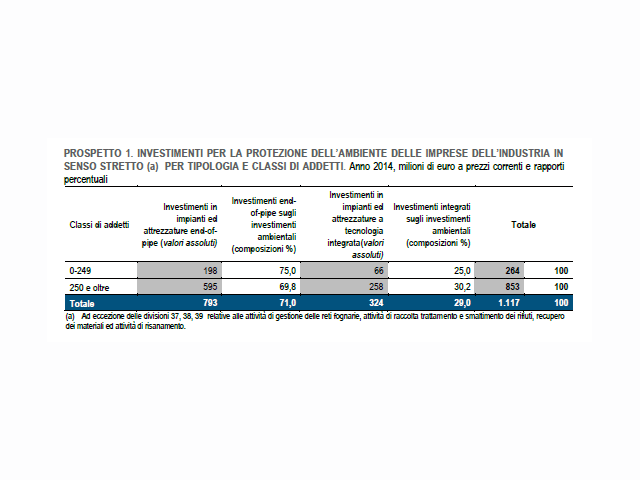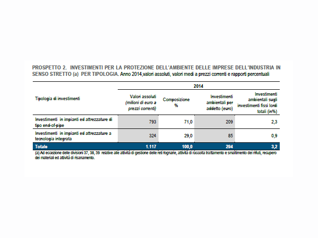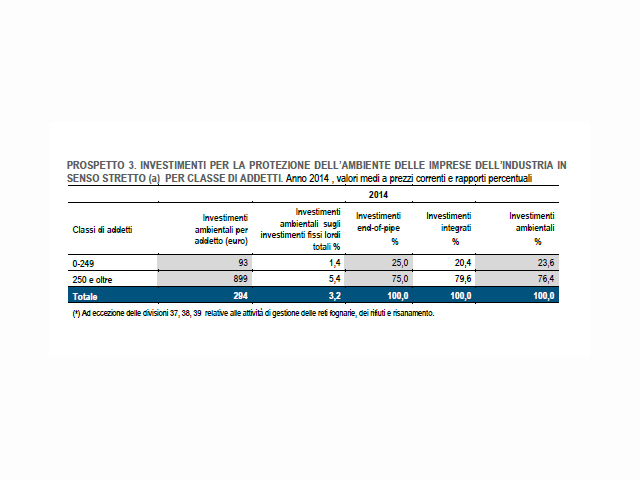 Nel 2014 gli investimenti ambientali per addetto sono stimati pari a 294 euro (358 euro nel 2013), ma sono elevate le differenze per dimensione aziendale: si passa, infatti, da 93 euro per addetto (154 euro nel 2013) nelle imprese di piccola e media dimensione a 899 euro per addetto (976 euro nel 2013) in quelle con 250 addetti e oltre (Prospetto 3).