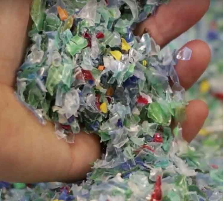 Dopo aver completato la selezione ottica, le bottiglie vengono sottoposte a un’ispezione manuale alla fine della quale si procede alla triturazione delle bottiglie per ottenere la granulometria finale del prodotto: le scaglie appunto.