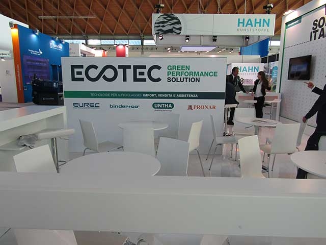 Lo stand Ecotec Solution è stato studiato per dare il giusto risalto ad ognuno dei marchi distribuiti in esclusiva dall'azienda: Untha, Pronar, Ecotec e Binder. Infatti l'ultima novità Ecotec Solution è stato proprio l'annuncio della collaborazione con Binder+Co, un marchio molto conosciuto nel settore recycling.