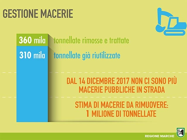 "Dal 14 dicembre 2017 non ci sono più macerie pubbliche in strada -  ha sottolineato il presidente della Regione Marche, Luca Ceriscioli -  e sono state rimosse e trattate 360mila tonnellate, ma la cosa più importante è che 310mila tonnellate sono state già riutilizzate. Durante i sopralluoghi in aree dove le macerie sono state completamente rimosse ci sono ancora strutture lesionate che non vanno scambiate con macerie non rimosse, perché alcune hanno il vincolo della sovraintendenza e non possono essere demolite. Per altre i proprietari vogliono riutilizzare la struttura esistente per la ricostruzione riutilizzando gli stessi materiali, pertanto questi non verranno demoliti o rimossi".