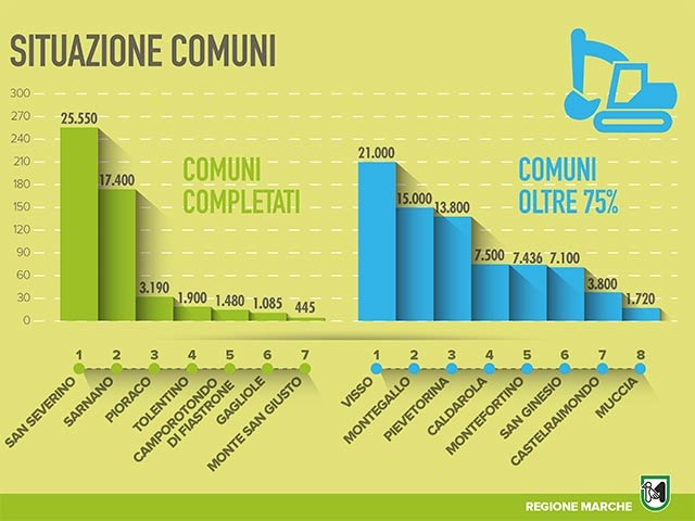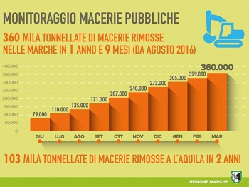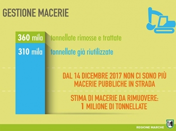 "Sette comuni marchigiani - ha proseguito il presidente -  hanno completato la rimozione delle macerie e in 8 comuni sono oltre il 75% le attività di rimozione. Facendo un paragone con l'Aquila, che assomiglia come orografia al nostro territorio in due anni erano state rimosse 103mila tonnellate, mentre nelle Marche tre volte e mezzo in un anno e sei mesi. Questa è la testimonianza di un dato importante, ma occorre fare aggiornamenti periodici andando sul posto, incontrando gli amministratori e migliorando, dove necessita, i siti di raccolta macerie. E stato più che appurato che nelle macerie non c'è presenza di amianto perché viene trattato nella primissima fase e non coinvolto nei passaggi successivi. Chi ha dato l'allarme lo ha fatto in maniera totalmente infondata. La stima della macerie totali scende da un milione 150 mila tonnellate ad un milione. Restano quindi 640mila tonnellate di macerie potenziali. Da dicembre, dopo che sono state rimosse tutte le macerie in strada, vengono trattate solo quelle provenienti da demolizioni, dettate dalle ordinanze dei sindaci.