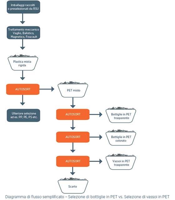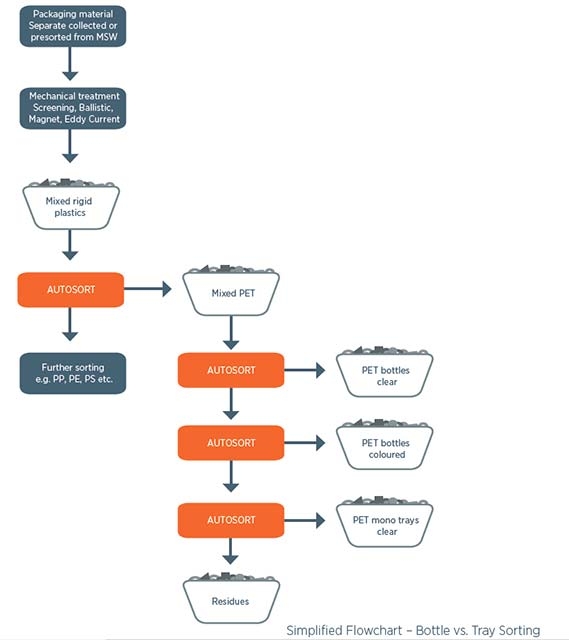 Il processo graduale che si conclude con la separazione delle vaschette monostrato in PET dalle bottiglie in PET è efficiente e flessibile. Durante la preparazione per la selezione delle plastiche miste in base ai polimeri, il materiale da imballaggio raccolto o pre-selezionato dai rifiuti solidi urbani (RSU) viene sottoposto a un processo di trattamento meccanico che riduce i materiali voluminosi, principalmente articoli morbidi come plastica, pellicole e prodotti non plastici. Per separare in seguito il PET misto nei diversi polimeri, AUTOSORT funziona come un sistema combinato, che rileva materiale e colore assieme alla granulometria. Questo processo raggiunge un'impressionante efficienza di selezione del 95% o superiore, persino con un materiale in ingresso molto misto.
