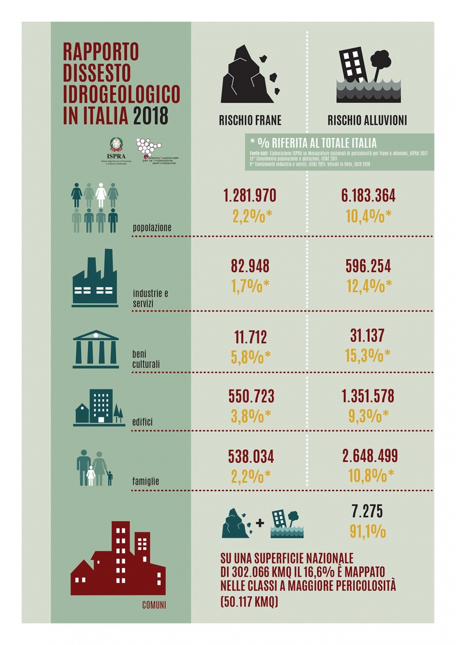 Complessivamente, sono oltre 7 milioni le persone che risiedono nei territori vulnerabili: oltre 1 milione vive in aree a pericolosità da frana elevata e molto elevata (PAI - Piani di Assetto Idrogeologico) e più di 6 in zone a pericolosità idraulica nello scenario medio (ovvero alluvionabili per eventi che si verificano in media ogni 100-200 anni). I valori più elevati di popolazione a rischio si trovano in Emilia-Romagna, Toscana, Campania, Lombardia, Veneto e Liguria.