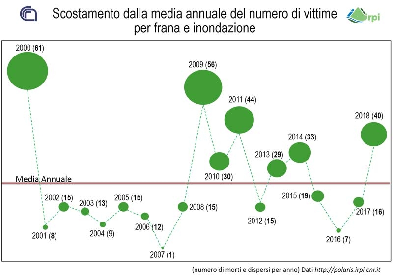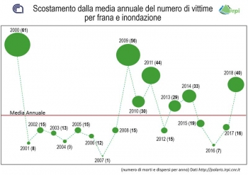 "Nel corso del 2018 frane e inondazioni hanno causato in Italia 38 morti, 2 dispersi, 38 feriti e oltre 4.500 tra sfollati e senzatetto in 134 comuni, distribuiti in 19 regioni. Le regioni più duramente ferite sono quelle del Sud. In particolare, Sicilia e Calabria sono quelle con il più alto numero di vittime". I dati riferiti da Paola Salvati sono quelli del ‘Rapporto periodico sul rischio posto da frane e inondazioni alla popolazione italiana’ per l’anno 2018 dell’Istituto di ricerca per la protezione idrogeologica del Consiglio nazionale delle ricerche (Cnr-Irpi) di Perugia, appena pubblicato sul sito Polaris.