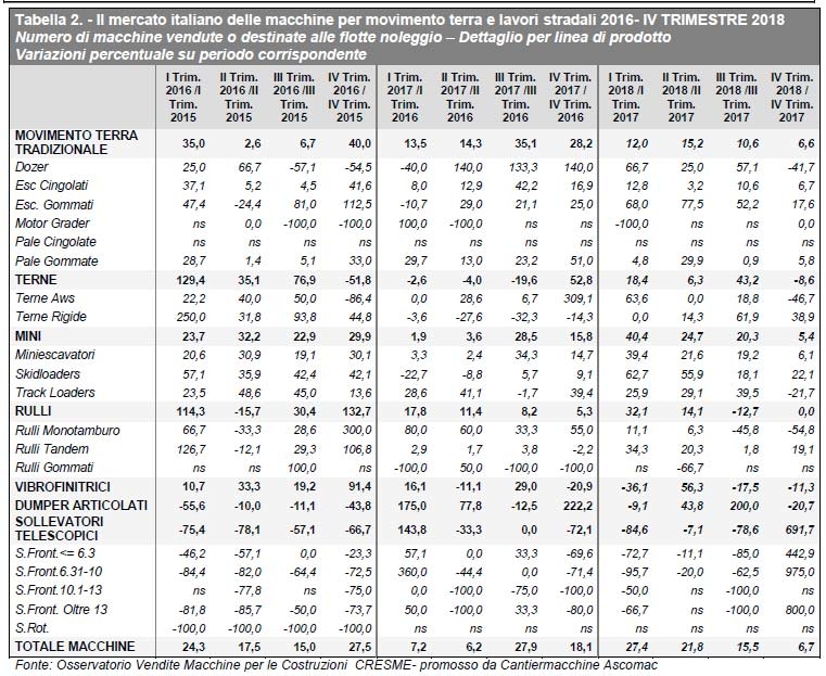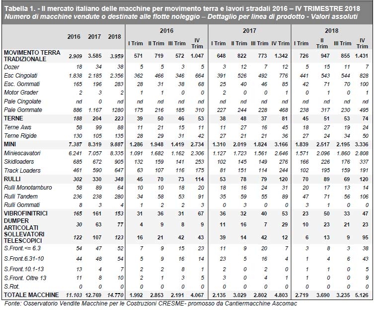 L'Osservatorio vendite macchine e impianti per le costruzioni del CRESME, promosso da Cantiermacchine-Ascomac, registra nel 4° trimestre 2018 un ulteriore segnale positivo: il mercato interno di macchine movimento terra e lavori stradali, con 5.126 macchine vendute o destinate alle flotte noleggio, cresce rispetto alle vendite realizzate nel 4° trimestre 2017 del +6,7%. Prosegue quindi la crescita cominciata nel 1° trimestre 2014, crescita costante nel corso degli ultimi 5 anni. La totalizzazione dei dati di questi ultimi 12 mesi, pari a 14.770 macchine vendute o destinate alle flotte noleggio, aumenta del +15,7% rispetto al 2017, e addirittura del +33,0% rispetto al 2016, anno in cui erano state rilevate 11.103 macchine.