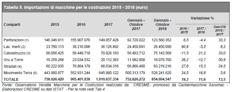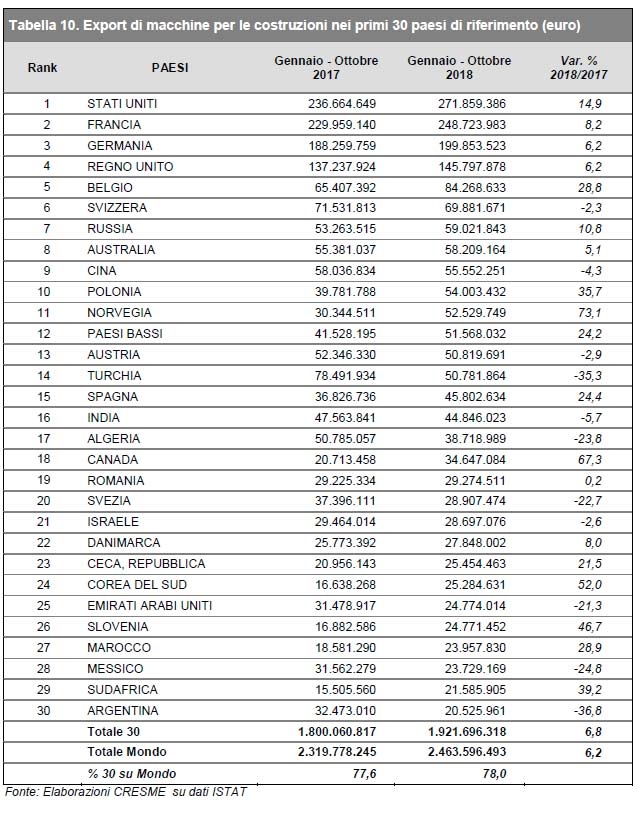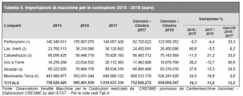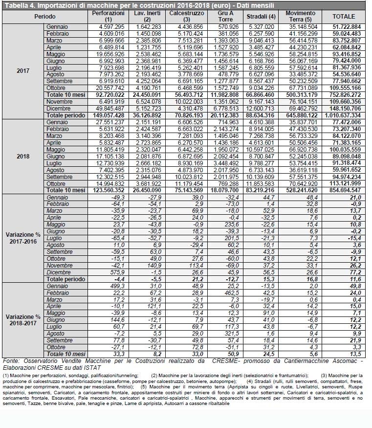 L’importazione di macchine per le costruzioni ad ottobre cresce del +3,3% rispetto al corrispondente periodo del 2017 e, grazie al costante andamento positivo che ormai persiste da oltre un anno, risulta nei primi 10 mesi del 2018 in crescita del +13,5% rispetto allo stesso periodo del 2017.
