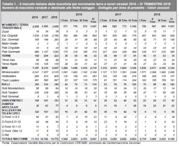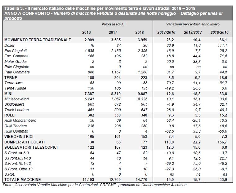 Totalizzando i dati nel 2016 erano state vendute/noleggiate 11.103 macchine con un incremento rispetto al 2015 pari al +21,6%. Anche il 2017 rispetto al 2016 aveva visto una crescita importante del +15,0%, pari a 12.769 macchine vendute/noleggiate. La crescita della domanda interna ha portato, in questo 2018, il totale delle macchine movimento terra e lavori stradali vendute o destinate alle flotte noleggio a 14.770, che vale il +15,7% rispetto al anno precedente.