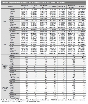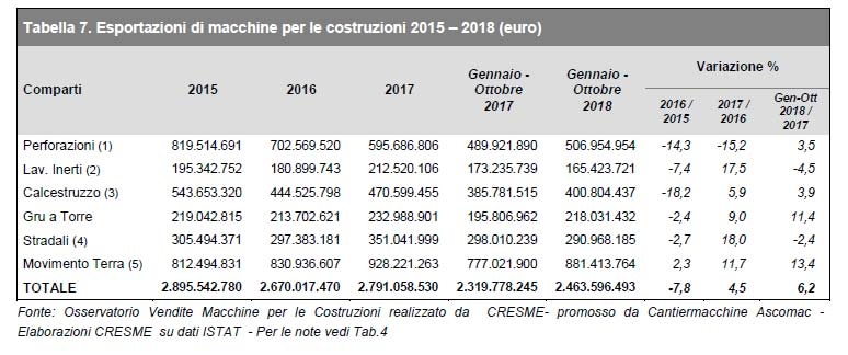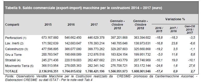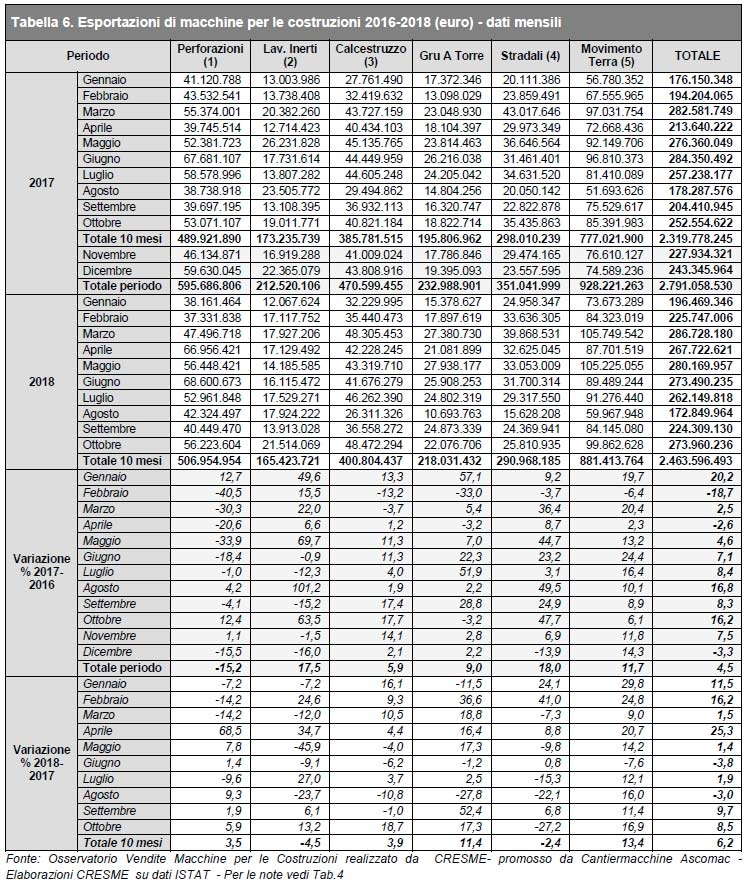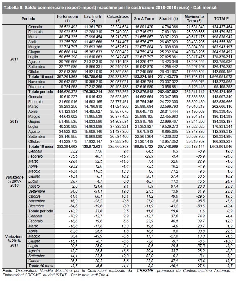 I dati della rilevazione ISTAT sul commercio estero nel periodo gennaio-ottobre 2018, confermano la crescita del settore; le importazioni di macchine per le costruzioni e lavori stradali aumentano a fine periodo del +13,5% su base annua. Anche le esportazioni, nonostante la flessione di agosto con il -3,0%, sono in crescita nella totalizzazione degli ultimi dieci mesi con il +6,2%. E con un saldo in attivo di 1.608,9 milioni di euro la bilancia commerciale supera il valore registrato nel periodo gennaio-ottobre 2017 del +2,7%.