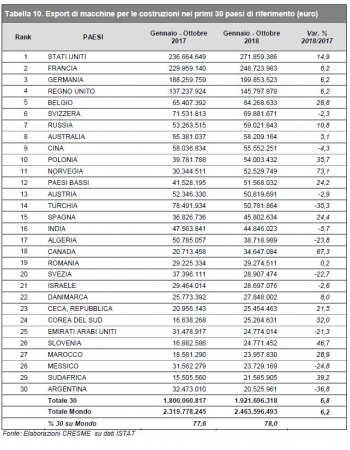 Al di sotto del +10% rimane, invece, la crescita delle esportazioni per le macchine per il calcestruzzo, che con 400,8 milioni di euro di macchine esportate registrano a fine periodo il +3,9% rispetto ai primi 10 mesi del 2017, e le macchine per perforazioni con il +3,5%.