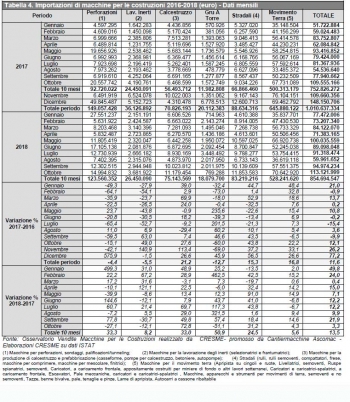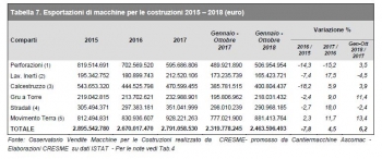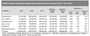 Tutti gli altri settori registrano su base annua variazione negative. La più significativa quella delle macchine per i lavori stradali, -10,1% pari a 207,7 milioni di euro, seguita da quella delle macchine per la lavorazione degli inerti, -6,6% pari a 139 milioni di euro. Per gli ultimi due settori, pur rimanendo attivo, il saldo è inferiore a quello totalizzato a ottobre 2017. Il dato delle macchine per perforazioni, il cui saldo commerciale pari a 383,4 milioni di euro è inferiore del - 3,5%, mentre quello delle macchine per il calcestruzzo -1,1%, pari a 325,7 milioni di euro.