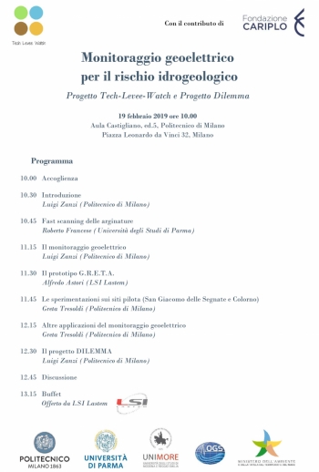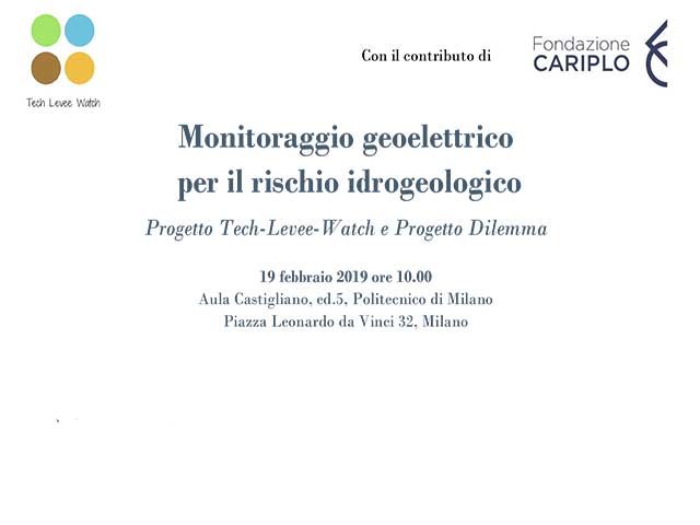 Martedì 19 febbraio 2019 presso il Politecnico di Milano, Piazza Leonardo da Vinci 32, Aula Castigliano ed.5, ore 10.00, si terrà il convegno dal titolo Monitoraggio geoelettrico per il rischio idrogeologico: Progetto Tech-Levee-Watch e Progetto Dilemma.