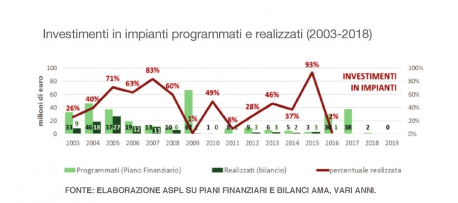 Negli ultimi 5 anni l’AMA, l’azienda attiva nella gestione integrata dei servizi ambientali nella Capitale, ha realizzato (bilancio) solo 6 dei 78 milioni di euro di investimenti programmati (piano finanziario) per gli impianti di gestione dei rifiuti a Roma.