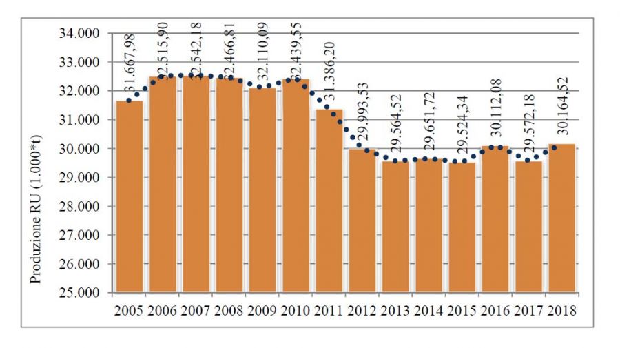 Dopo sei anni di decrescita, sotto 30 milioni di tonnellate, nel 2018 la produzione nazionale dei rifiuti urbani torna a superare tale cifra e si attesta a quasi 30,2 con un aumento del 2% rispetto al 2017. La crescita è ancora maggiore se si guarda al dato pro capite: +2,2%, che in termini di quantità è pari a poco meno di 500 chilogrammi per abitante.