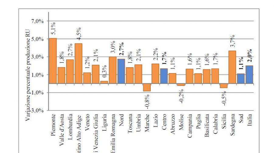 Trend di nuovo in crescita con il PIL, urgenti politiche di prevenzione. Sette regioni su venti arrivano al 65% di differenziata fissato dalla normativa, salto in avanti per Sicilia e Molise. Impianti non al passo con le esigenze della differenziata, pochi e mal distribuiti. Organico il più raccolto, ma alcune regioni senza impianti per trattarlo.