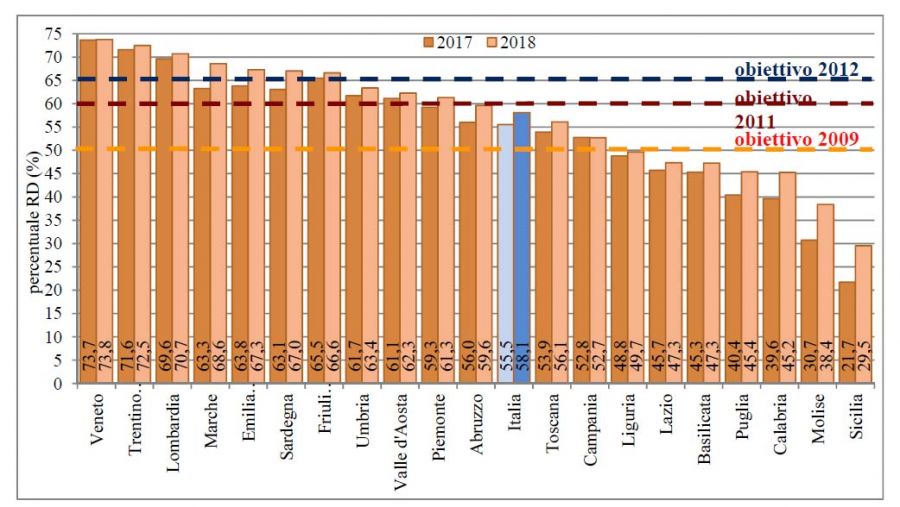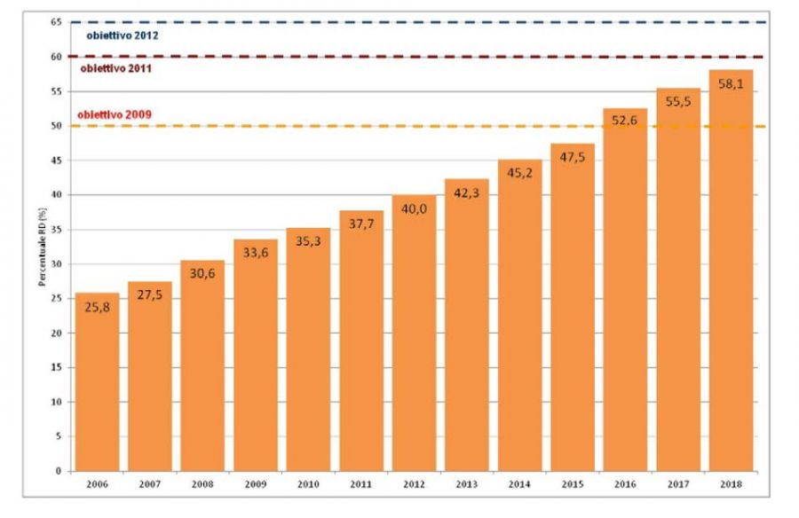 Si conferma il trend di crescita anche nel 2018 con un +2,6 punti percentuali a livello nazionale rispetto all’anno precedente, raggiungendo così il 58,1%. Nell’ultimo decennio la percentuale è aumentata di quasi 25 punti percentuali, passando dal 35,3% al 58,1%. In termini quantitativi da circa 9,9 milioni di tonnellate a 17,5 milioni di tonnellate.