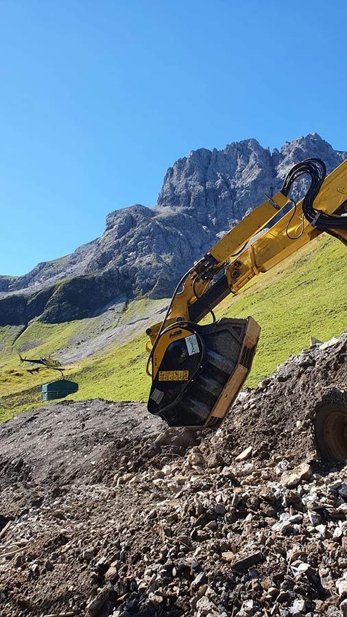 Soluzione: è stato utilizzato il Frantoio mobile BF60.1 per lavorare il materiale in loco e riutilizzarlo per i fondi delle strade forestali. Come è arrivato al rifugio dato che l’elicottero può portare al massimo 1200 kg? La benna frantoio è stata alleggerita con facilità e velocità di alcune parti, portata in quota e assemblata in tempi rapidi.