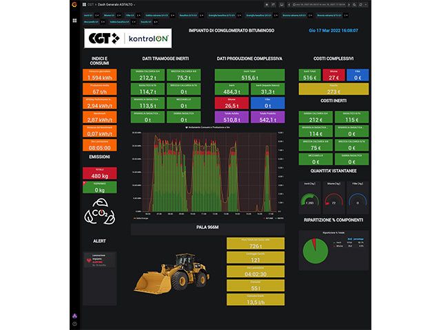 KontrolON può essere impiegato su più impianti contemporaneamente e risulta quindi essenziale per chi ha più siti distanti fra loro. È un prezioso alleato per misurare la quantità del materiale prodotto, individuare le risorse sprecate, i consumi energetici e le spese di produzione. Informazioni solitamente difficili da reperire, ma che sono fondamentali per gestire al meglio gli impianti. I Clienti CGT avranno anche il vantaggio di poter visualizzare in una sola dashboard oltre che i dati dell’impianto, anche quelli delle macchine Caterpillar che lavorano nello stesso sito produttivo.