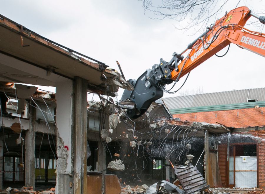 Il Doosan DX380LC-7, con braccio standard e munito di pinza da demolizione da 42 quintali, si è occupato dell'intera opera di demolizione primaria della struttura da rimuovere, per un totale di 14.000 mc. Nella prima fase il DX380LC-7 ha abbattuto la struttura centrale a campate adiacenti all'edificio principale. Quindi sono state esportate le pareti perimetrali della palazzina a due piani. Questo ha consentito di produrre le macerie necessarie per sollevare l'escavatore e poter quindi facilmente raggiungere il secondo piano.