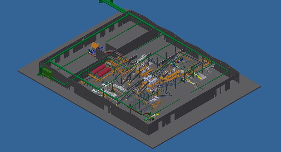 Il progetto prevede l’impiego di una doppia linea di pretrattamento che garantirà 35 t/h cadauna. L’analisi dei flussi ha condotto quindi ad elaborare un layout altamente flessibile, in grado di massimizzare le prestazioni attese.