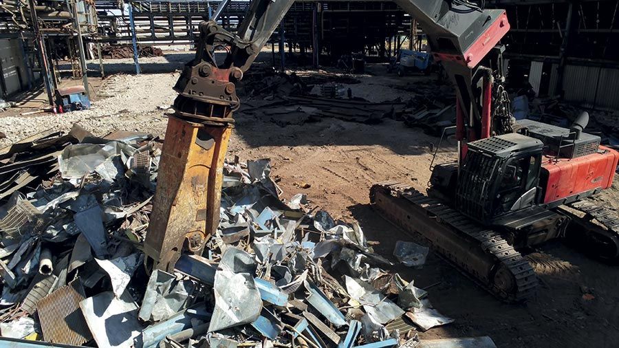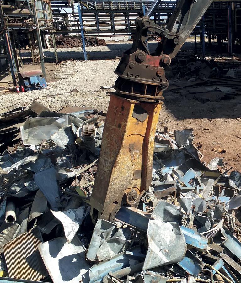 Le fasi operative del cantiere sono concettualmente semplici. Ad oggi si è infatti provveduto alla completa demolizione dei cinque serbatoi che contenevano l’olio combustibile per il funzionamento delle caldaie. Quattro hanno una capacità di 50.000 metri cubi e uno 100.000. Le cesoie Indeco sono quindi state fra le prime in assoluto a entrare in scena. La ISS 20/30 è installata in modo quasi permanente su un escavatore idraulico Doosan DX340LCN-5 mentre la più grande ISS 30/50 è utilizzata da un escavatore da demolizione Kiesel KMC600. Entrambe sono costantemente impegnate nella demolizione dei manufatti e nel successivo taglio del materiale per la riduzione volumetrica. Operazione che facilita il carico per l’invio in fonderia.