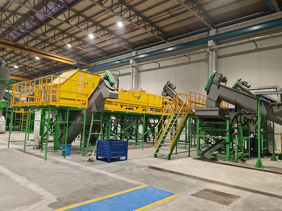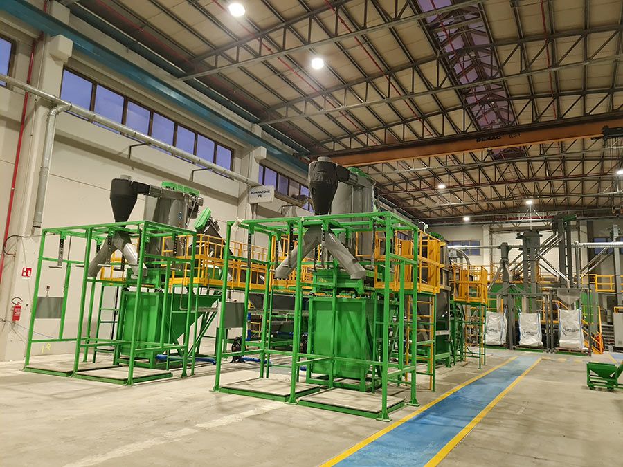 Linea WET: per ottenere una elevata qualità della plastica riciclata, la pulizia del materiale in ingresso è fondamentale: come prima cosa si separano eventuali materiali estranei come ferro, polveri, attraverso vagli, magneti e sistemi aeraulici. Dopo questa fase di separazione, le plastiche sono sottoposte a flottazione: nelle prime 2 vasche si rimuovono prima i metalli e poi le plastiche “caricate”, ovvero potenzialmente contenenti i ritardanti di fiamma bromurati, come previsto dal d.Lgs. 49/2014. Proseguendo con le fasi di pulizia, mediante sensori ottici vengono rimossi frammenti di legno.