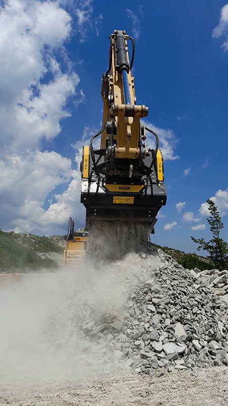 “Con la benna frantoio di MB Crusher siamo in grado di controllare noi i nostri scarti, maciniamo quando vogliamo e ne facciamo l’uso che vogliamo”. Così la pensa l’azienda marchigiana in Italia Eurocave, proprietaria di diversi siti dove estraggono pietra serena e pietra alberese. La pietra estratta viene direttamente lavorata dalla stessa Eurocave per realizzare elementi e opere di architettura. Con lo scarto della lavorazione – frantumato con un frantoio a mascelle BF120.4 di MB Crusher – sistemano le piste in cava senza dover acquistare frantumato all’esterno o lo rivendono come inerte per sottofondi stradali.