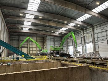 Nel moderno impianto per la selezione dei rifiuti Val’Up in Belgio, sono stati scelti due caricatori elettrici Sennebogen che scorrono su binari al posto del carroponte.
