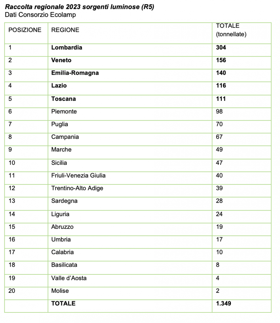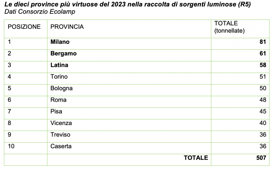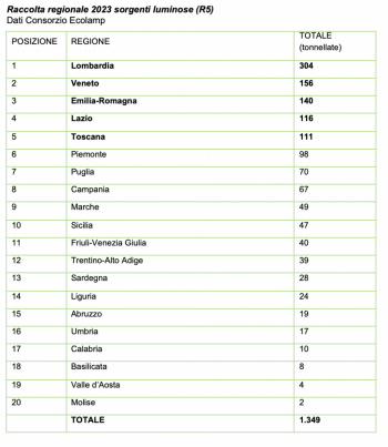 A livello nazionale, al primo posto per la raccolta di sorgenti luminose si conferma la Lombardia, con 304 tonnellate smaltite, seguita da Veneto (156), Emilia-Romagna (140), Lazio (116) e Toscana (111). Per quanto riguarda le provincie, Milano (81), Bergamo (61, salendo di due posizioni) e Latina (58) sono quelle che hanno avviato a riciclo il maggior numero di sorgenti luminose esauste. Si segnalano inoltre dati positivi per la provincia di Caserta, che passa dalle 22,5 alle 36 tonnellate, e Bari, da 23 a 30.