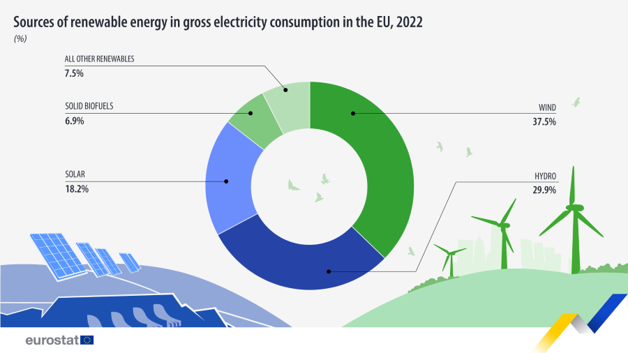 Infatti, il rapporto sottolinea che le energie rinnovabili stanno già crescendo rapidamente nell'UE, rappresentando il 41,2% del consumo lordo di elettricità nel 2022, con un aumento del 5,7% rispetto all'anno precedente. Paesi come la Svezia già dipendono principalmente da fonti rinnovabili per il loro consumo di elettricità. L’energia eolica e idroelettrica rappresentano oltre i due terzi dell’elettricità totale generata da fonti rinnovabili (rispettivamente 37,5% e 29,9%). Il restante terzo dell'elettricità proveniva dal solare (18,2%), dai biocarburanti solidi (6,9%) e da altre fonti rinnovabili (7,5%). L’energia solare è la fonte in più rapida crescita: nel 2008 rappresentava solo l’1% dell’elettricità consumata nell’UE. La maggior parte del consumo di elettricità della Svezia nel 2022 proveniva da fonti rinnovabili (83,3%, principalmente idroelettrica ed eolica), seguita da Danimarca (77,2%, principalmente eolica) e Austria (74,7%, principalmente idroelettrica). Quote superiori al 50% si sono registrate anche in Portogallo (61,0%), Croazia (55,5%), Lettonia (53,3%) e Spagna (50,9%). (Fonte Eurostat)