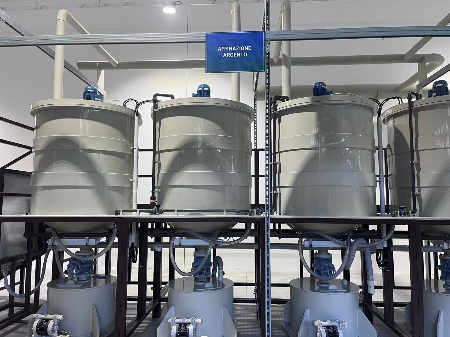 I primi vengono smaltiti, mentre il rame viene ulteriormente lavorato per diventare idoneo al riutilizzo. Nella seconda fase di Leaching i componenti triturati vengono trasferiti in sei reattori, dove entrano in contatto con soluzioni acide specifiche per estrarre argento, oro e palladio. Il rame viene purificato tramite un processo elettrolitico, l’argento viene trasformato in cloruro di argento e poi fuso in lingotti, mentre l’oro viene purificato e trasformato in lingotti 24 carati. Infine il palladio viene recuperato sotto forma di sale disciolto in una soluzione liquida.